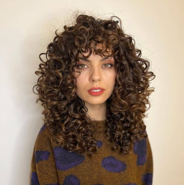 56. Voluminous Shoulder-Length Curly Layers with Bangs