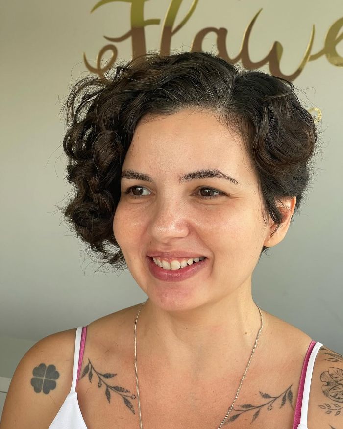 This long pixie haircut features an array of soft, bouncy curls that create playful volume and movement around the crown. The carefully styled texture adds a touch of glamour, making it ideal for those who want a hairstyle that exudes both confidence and femininity. Perfect for women looking to showcase their natural hair texture while maintaining a chic and effortless vibe.