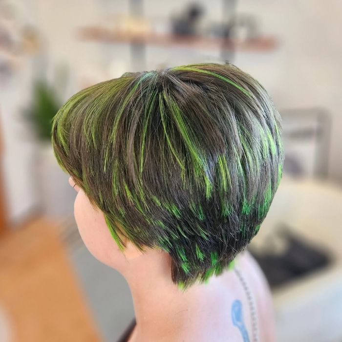 This long pixie haircut features a playful blend of green and blue hues that create an eye-catching and fresh look. The textured layers add movement and depth, giving the style a modern, tousled vibe perfect for those who want to express their individuality. Ideal for creative personalities, this haircut makes a bold statement while remaining effortlessly chic.
