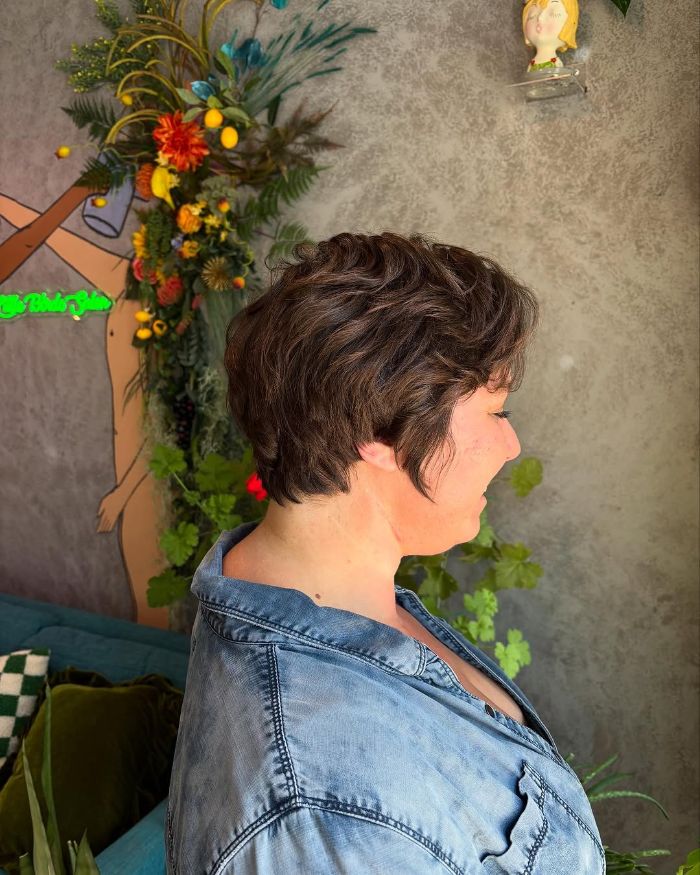 This long pixie haircut showcases a playful, textured look with soft, messy curls that add volume and dimension. The subtly highlighted strands create depth, framing the face beautifully and enhancing the natural features. Ideal for those who enjoy a carefree style that combines a youthful vibe with a touch of sophistication, this cut suits anyone who wants a low-maintenance yet stylish option.