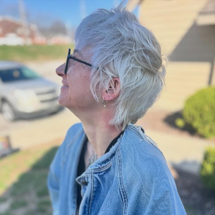 This style features bouncy, soft curls that create an effortlessly chic look, with a playful volume that frames the face beautifully. The light blonde hue enhances the texture, adding brightness and an energetic vibe to the overall appearance. Ideal for individuals who embrace a fun, whimsical style, this long pixie is perfect for those looking to showcase their personality through a unique and lively haircut.