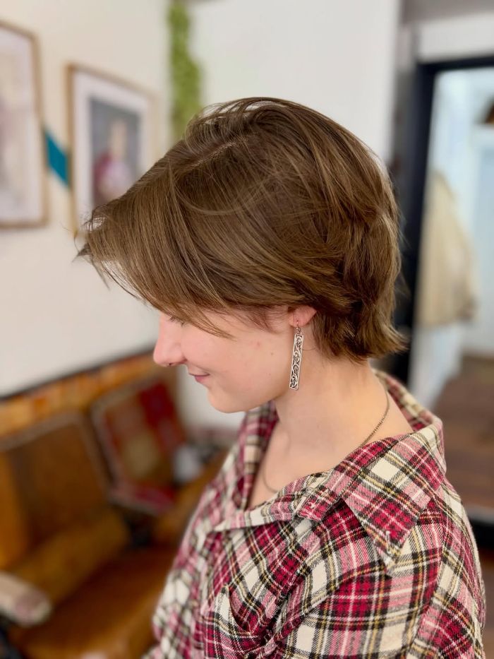 This long pixie hairstyle features a balanced blend of soft layers that create movement and dimension, particularly around the crown and towards the back. The warm, subtly mixed highlights enhance the natural texture, adding a touch of brightness that beautifully frames the face. Ideal for those seeking a low-maintenance yet stylish look, this cut offers elegance and ease, perfect for both casual and formal settings.