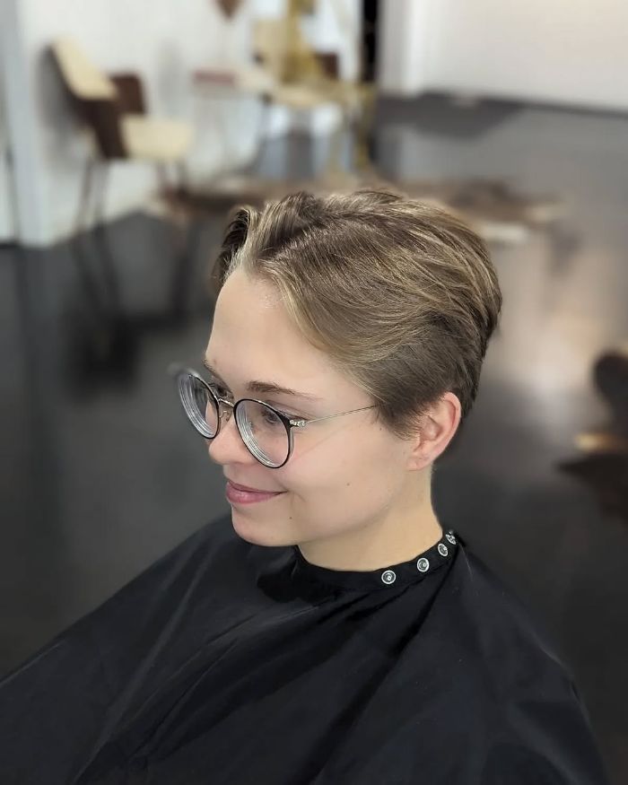 This style features a meticulously textured short pixie cut that highlights soft layers around the crown, giving a playful yet sophisticated look. The length remains close to the scalp, allowing the hair to naturally frame the face while offering a chic separation around the ears. Ideal for those looking to combine modern elegance with effortless style, this haircut suits a range of occasions from casual outings to upscale events, providing versatility for the confident individual.