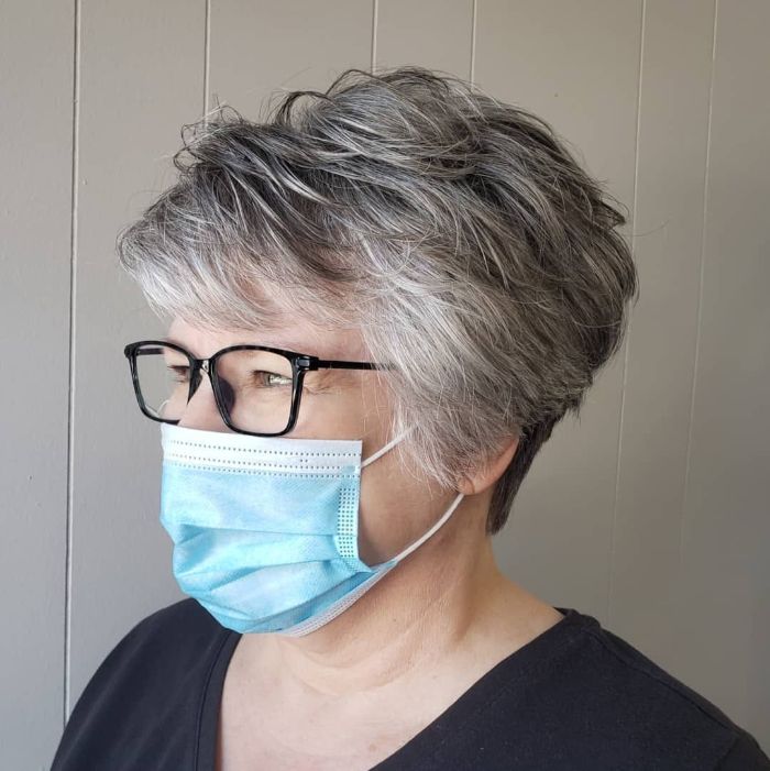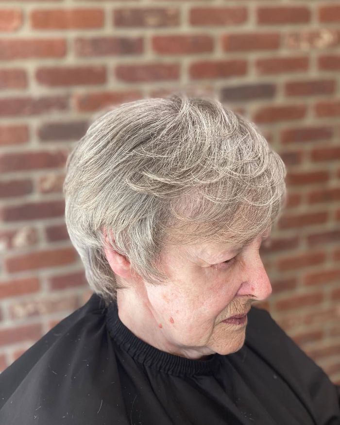 This beautiful long pixie haircut features soft, textured layers that frame the face elegantly, emphasizing natural features. The subtle grey tones add a sense of sophistication and modernity, making it an ideal choice for those who appreciate a low-maintenance yet stylish look. This haircut suits mature individuals looking to blend comfort with chic style, providing a fresh and youthful appearance.