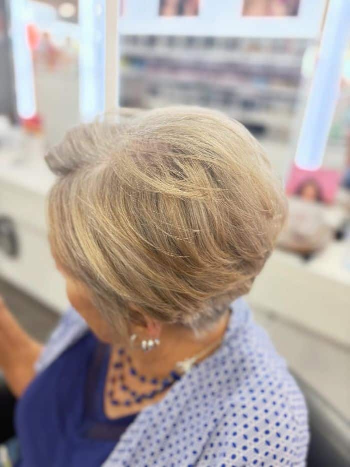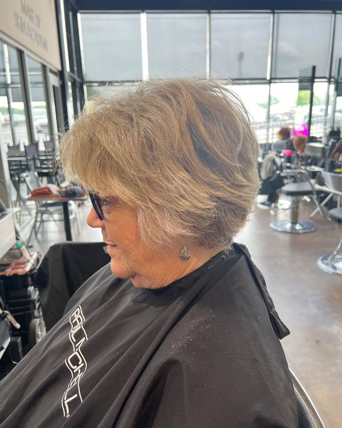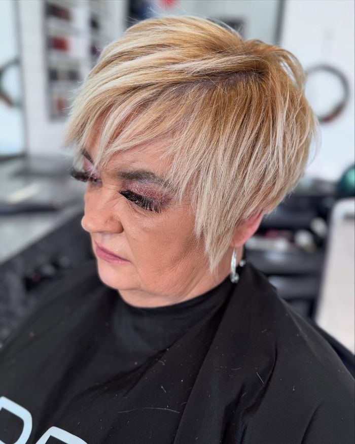 This style features a soft, layered long pixie cut that beautifully frames the face, with gentle, wispy bangs that add a touch of femininity. The light, textured layers create a natural volume, making it ideal for those seeking a chic yet low-maintenance look. Perfect for mature individuals who want a hairstyle that exudes sophistication while still being youthful and vibrant.