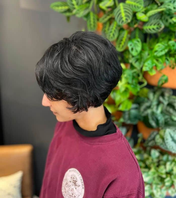 This long pixie haircut showcases a beautifully textured look that blends soft waves at the back with sleek, polished sides. The subtle highlights add dimension and warmth, making it a versatile style that flatters a range of skin tones. Perfect for those seeking a low-maintenance yet stylish haircut, this design exudes modern elegance with a touch of effortless charm.