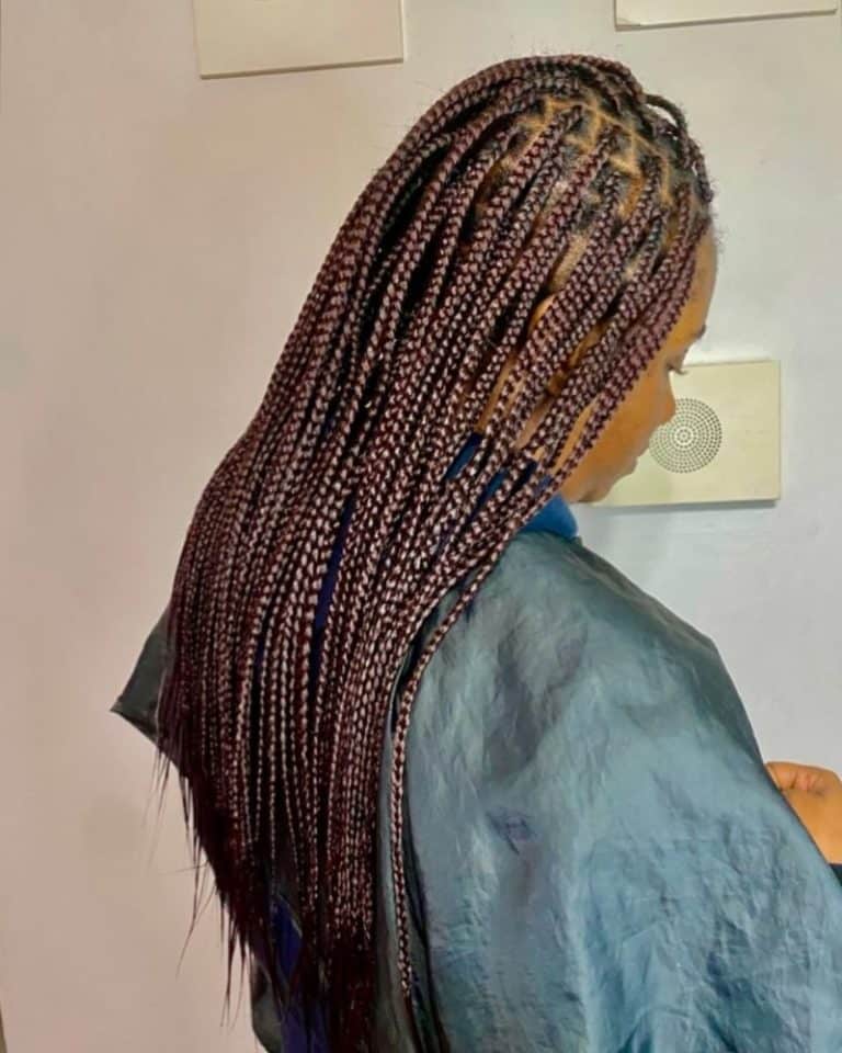 This hairstyle features long individual box braids that cascade down the back, offering a striking visual impact. Each braid is neatly created with a consistent thickness, closely woven and perfectly aligned, showcasing meticulous craftsmanship. Ideal for those looking to express their individuality while maintaining a protective style, it seamlessly blends elegance with versatility, making it suitable for both casual outings and special events.