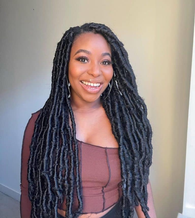 This hairstyle features long, twisted locs that cascade down the shoulders, creating a relaxed yet stylish look. The loose ends add a touch of softness, perfect for those seeking a protective style that highlights natural texture while maintaining a modern edge. Ideal for individuals who want to combine versatility with a bold statement, this style can be worn for both casual outings and more polished events.