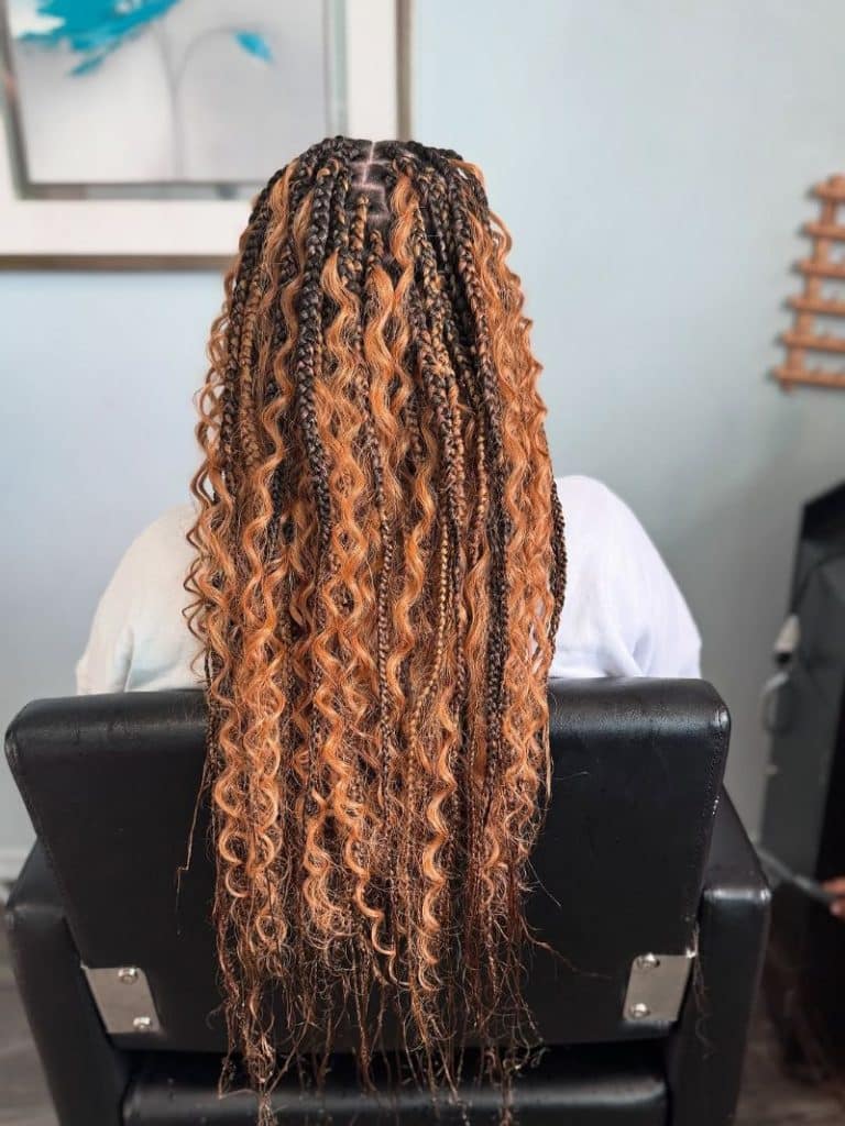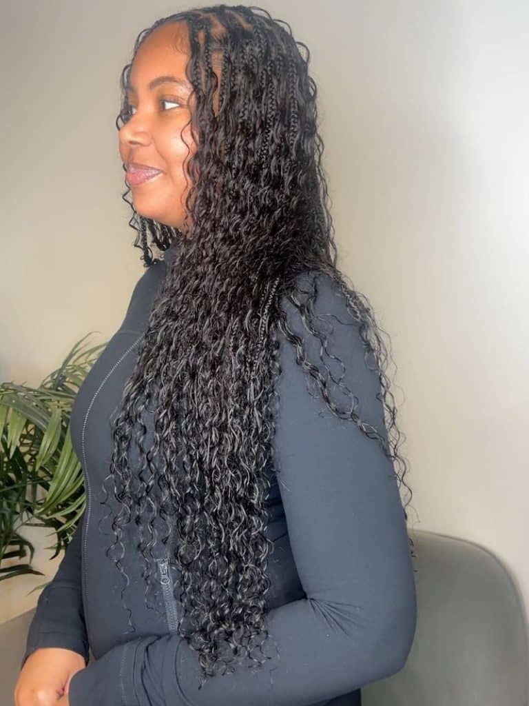 This style features intricately braided box braids interspersed with flowing, loose curls that cascade down the shoulders. The unique combination of structured braids at the roots and soft waves creates a striking contrast, making it a perfect choice for those who want to blend protective styling with a touch of glamour. Ideal for fashion-forward individuals looking to showcase their natural hair while enjoying a versatile look that can be dressed up or down.