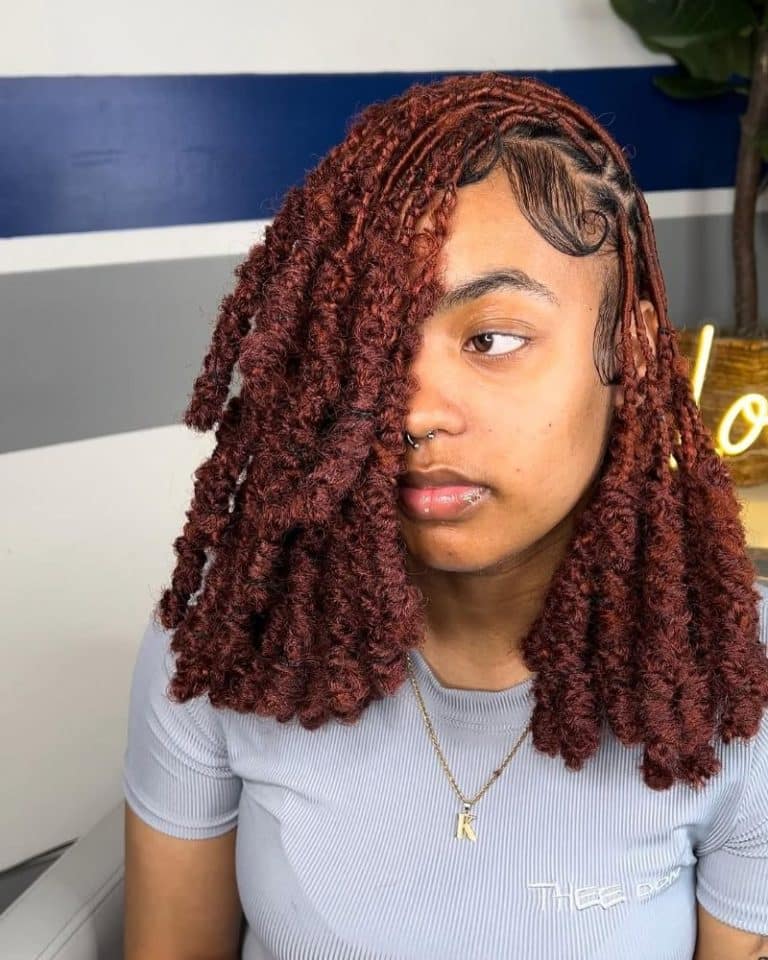 This style showcases playful, bob-length distressed locs that add a unique twist to traditional locks, offering texture and movement. The bold, asymmetrical cut highlights the face beautifully, while a subtle gold accent complements the look, making it perfect for those who want a trendy and contemporary vibe. Ideal for individuals who appreciate both style and simplicity, this hairstyle resonates well with an active lifestyle and a flair for creativity.