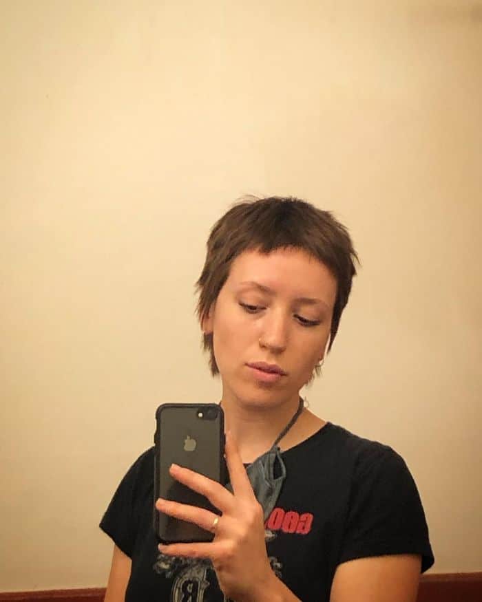 This short pixie haircut features a blend of choppy layers that add both texture and movement, perfect for a fresh, modern look. The lively bangs frame the face, enhancing the eyes and offering a playful character, making it an ideal style for those who embrace a carefree aesthetic. Suited for various face shapes, this hairstyle is perfect for individuals looking to make a bold yet effortless statement.