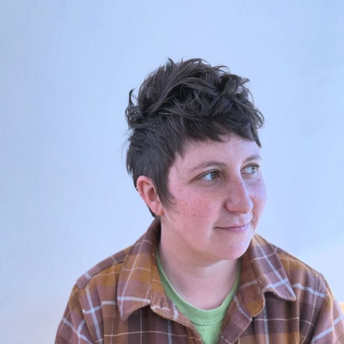 This hairstyle showcases a short choppy pixie cut, characterized by its playful, textured layers that add volume and movement to the hair. The slightly tousled top complements the sharp, closely cropped sides, creating a modern, edgy look that is perfect for those who want to express their individuality. Ideal for individuals seeking a low-maintenance yet stylish haircut, this look exudes confidence and charm with a hint of effortless flair.