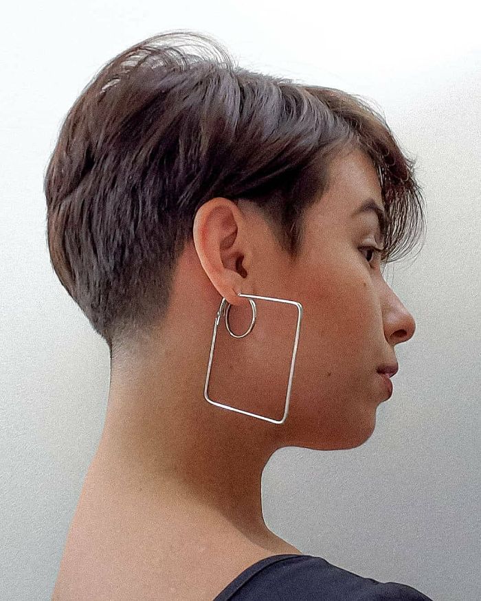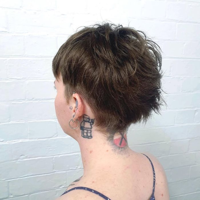 This striking hairstyle features a bold undercut that accentuates a voluminous, choppy top, creating a contemporary and edgy look. The rich, warm brown tones enhance the textured layers, adding depth and dimension. Ideal for those looking to make a statement, this style suits individuals who appreciate a modern twist on classic short haircuts and want a low-maintenance yet stylish option.