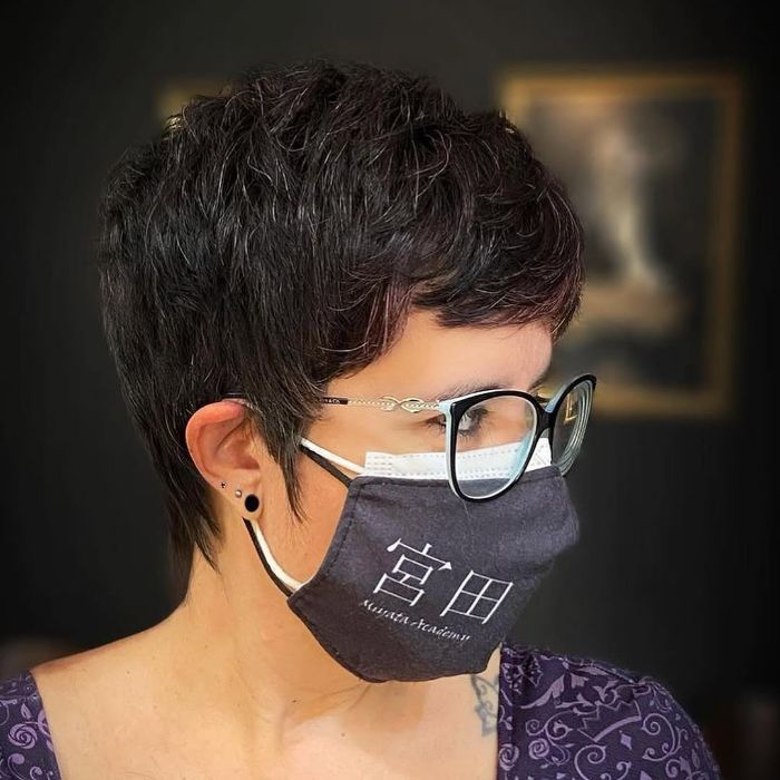 This short textured crop features choppy, feathered layers that create a soft, airy appearance around the crown, while the sides are neatly tapered for a polished look. The dark hair is styled with subtle volume, emphasizing the playful texture and effortlessly framing the face. Ideal for those seeking a modern, low-maintenance haircut that pairs well with bold makeup choices, this style exudes confidence and individuality.