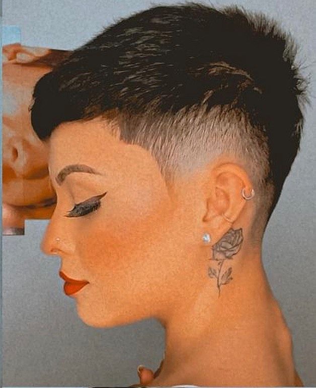 This stylish short pixie cut features a playful blend of textures and lengths, with slightly longer layers on top that create volume and movement. The sleek, dark finish adds a modern edge, perfectly framing the face and accentuating the features. Ideal for those seeking a low-maintenance yet chic look, this hairstyle suits individuals who want to express their personality while keeping it effortlessly stylish.
