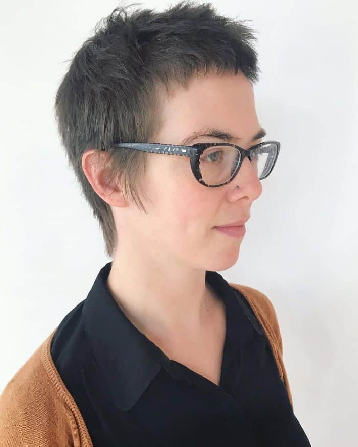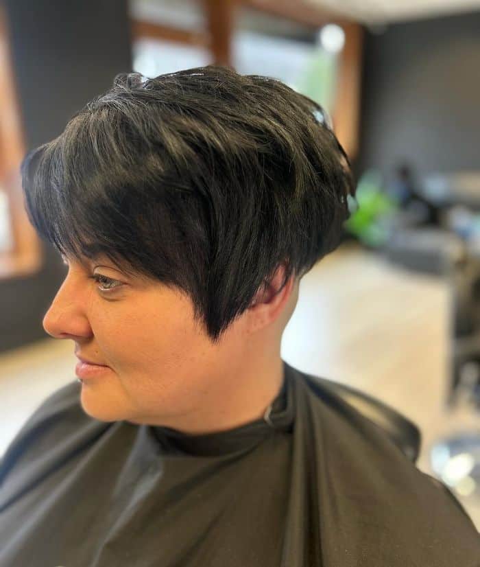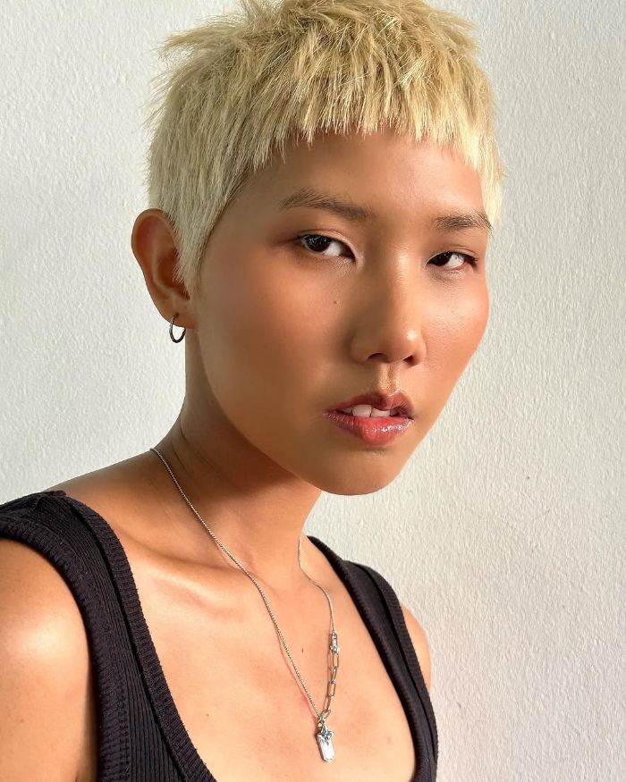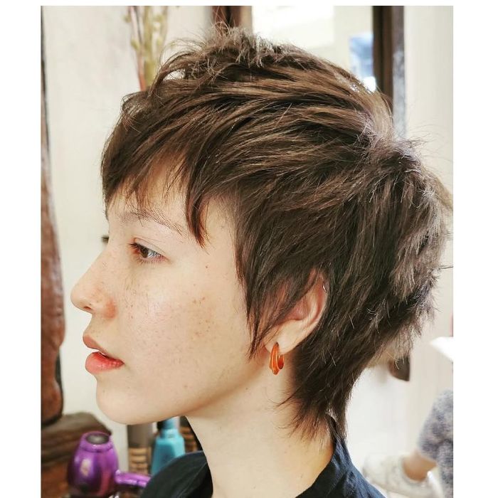 This style features a bold, textured pixie cut with sharp, choppy layers that create a striking silhouette. The jagged fringe draws attention to the eyes, making it perfect for those who want to make a statement while radiating confidence. Ideal for fashion-forward individuals seeking a modern, edgy look that complements bold makeup and statement accessories.