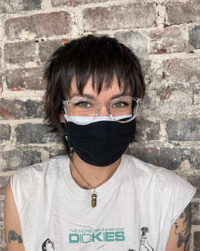 This short choppy haircut features a dynamic mix of textured layers that create an effortlessly chic vibe. The layered design adds volume and movement, while the subtle highlights enhance the rich brown base, giving it depth and dimension. Perfect for those seeking a low-maintenance yet stylish look, this haircut suits individuals with a bold personality who enjoy modern and playful hairstyles.