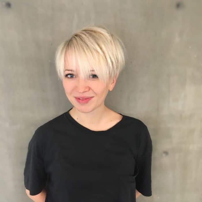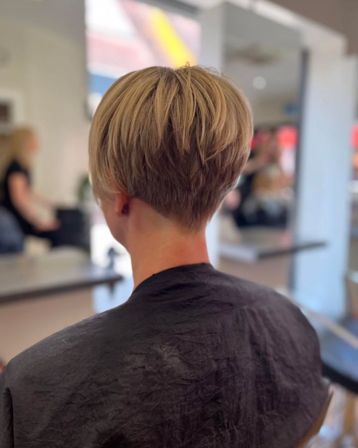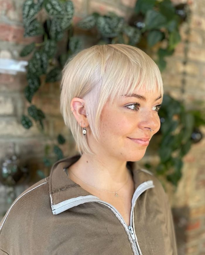 This hairstyle features a chic short bob characterized by its voluminous top and a blunt fringe that frames the face beautifully. The back is closely cropped, enhancing the layers and adding depth, while the light blonde color with subtle highlights gives it a fresh and modern look. Perfect for those seeking a playful and easy-to-style haircut, this look suits individuals who appreciate a balance of elegance and effortless charm.