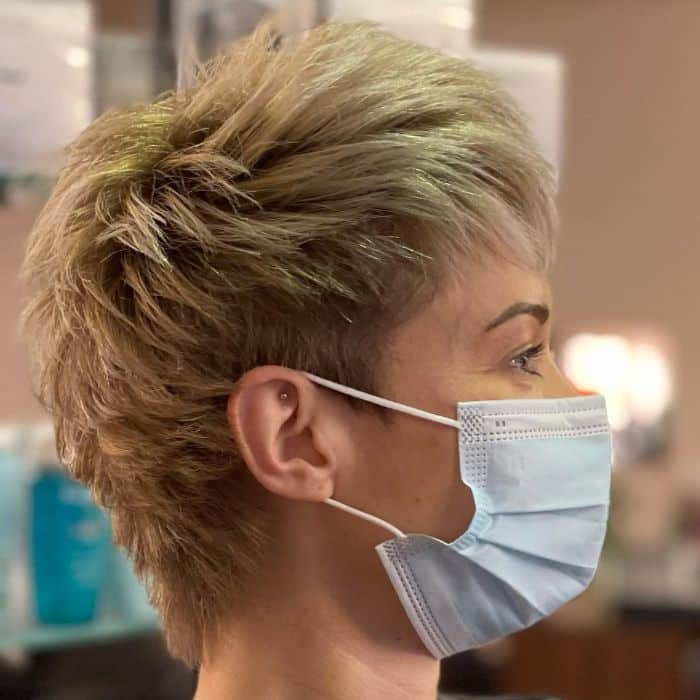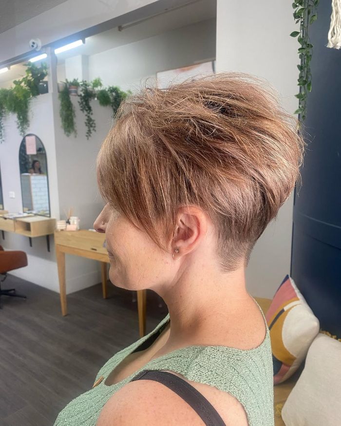 This style features a striking combination of a short, choppy top layer contrasted with a crisp undercut at the nape, creating a modern and edgy look. The soft, golden hues offer warmth and dimension, while the asymmetrical styling gives it a playful twist. Ideal for those looking to make a bold statement, this haircut suits individuals who embrace a contemporary aesthetic and appreciate low-maintenance hair that stands out.