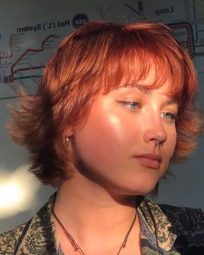 This short choppy haircut exudes a playful, carefree vibe with its soft, tousled layers. The hair features varied lengths, creating a dynamic shape that frames the face beautifully while adding volume on top. Ideal for those looking for an easy-to-maintain style that still offers personality, this haircut suits individuals with a laid-back yet trendy aesthetic.