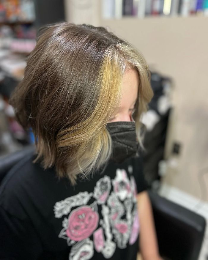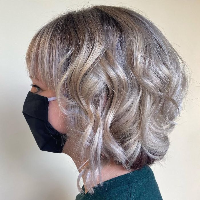 This hairstyle features a short, choppy bob that combines playful waves with a soft, tousled texture. The light blonde highlights add dimension to the look, making it perfect for those seeking a modern yet effortless style. Ideal for individuals wanting a chic, low-maintenance option that still exudes personality.
