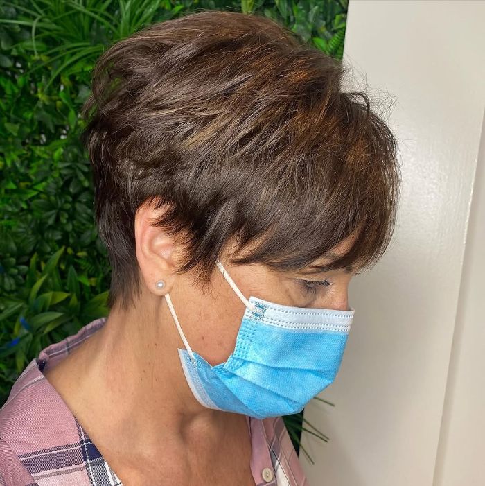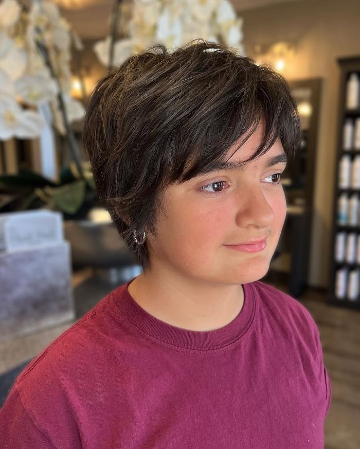 This style features a playful short pixie cut enhanced by choppy layers that create a light, textured silhouette. The bangs are slightly longer and tousled, framing the face beautifully while the overall look exudes a carefree yet edgy vibe. Ideal for those seeking a modern, low-maintenance hairstyle that adds a youthful touch, this cut is perfect for anyone wanting to make a bold statement.