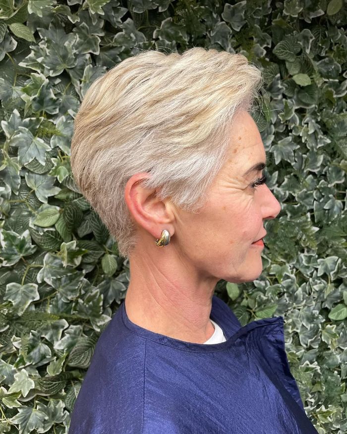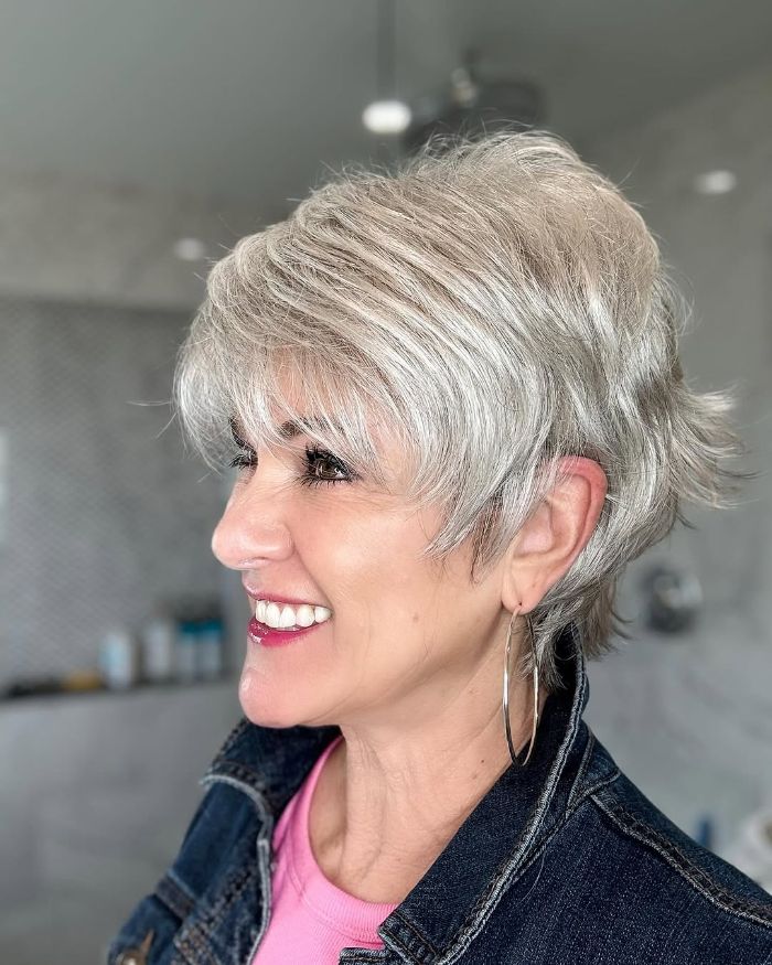 This short choppy pixie cut showcases a sophisticated blend of textured layers and a striking silver hue, making it a modern and elegant choice. The soft volume on top contrasts beautifully with the tapered sides, framing the face delicately and enhancing natural facial features. Ideal for those seeking a chic, low-maintenance hairstyle that exudes confidence, this look suits women who appreciate a blend of timelessness and contemporary flair.
