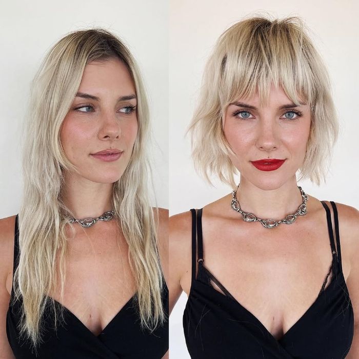 This style features a bold transformation from a longer, tousled cut to a close-cropped, textured hairstyle. The sharp layers and defined angles create a modern and edgy aesthetic that frames the face beautifully, highlighting the model’s features. Ideal for those who crave an effortlessly chic look with minimal upkeep, this haircut suits a variety of hair types and adds a playful yet sophisticated touch to any wardrobe.