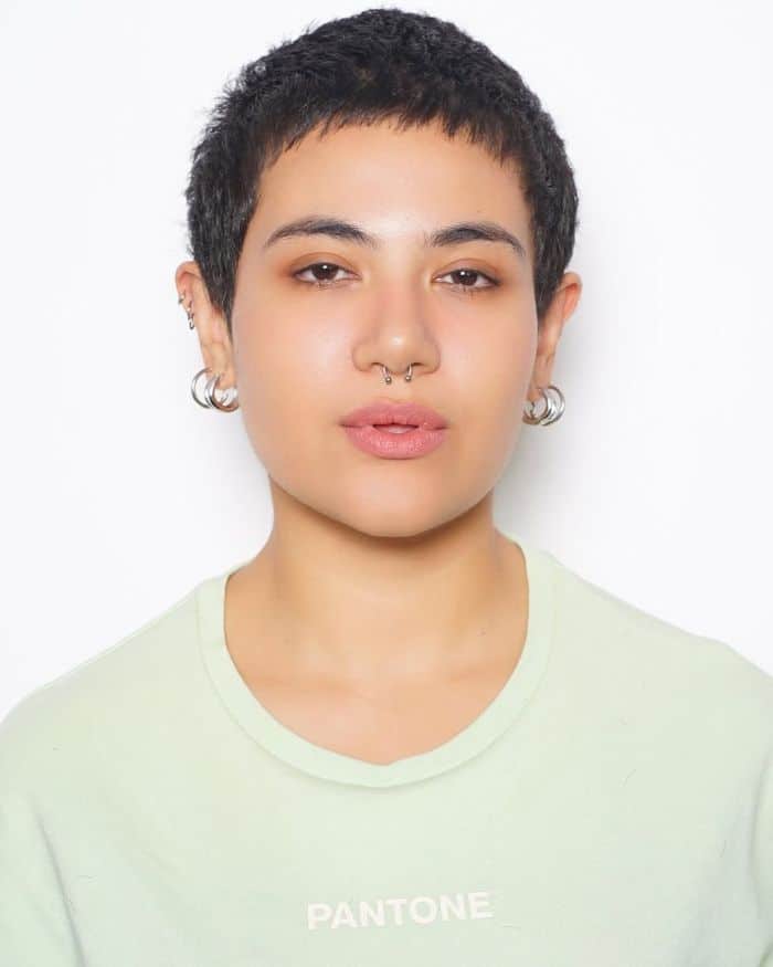 This short choppy pixie cut features layered textures that create a playful, tousled look. The hair is styled to enhance movement, with a slightly longer fringe that adds softness to the angular face. Ideal for those seeking an edgy yet sophisticated style, this haircut suits individuals who embrace their natural hair texture and love to experiment with their appearance.