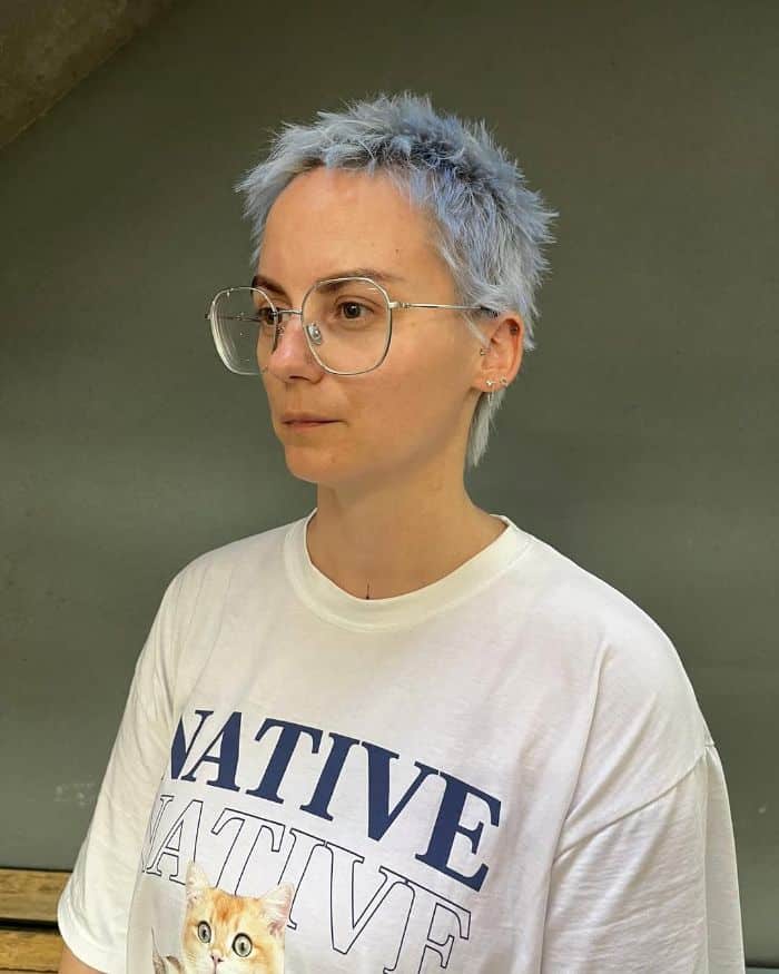 This striking hairstyle features a silvery pixie cut marked by choppy, textured layers that create volume and movement on top. The subtly tapered sides add a modern edge, allowing the longer strands to frame the face beautifully, making it an excellent choice for those seeking a bold yet manageable look that exudes confidence and style. Perfect for individuals who want to make a fashion statement while keeping their hair low-maintenance.