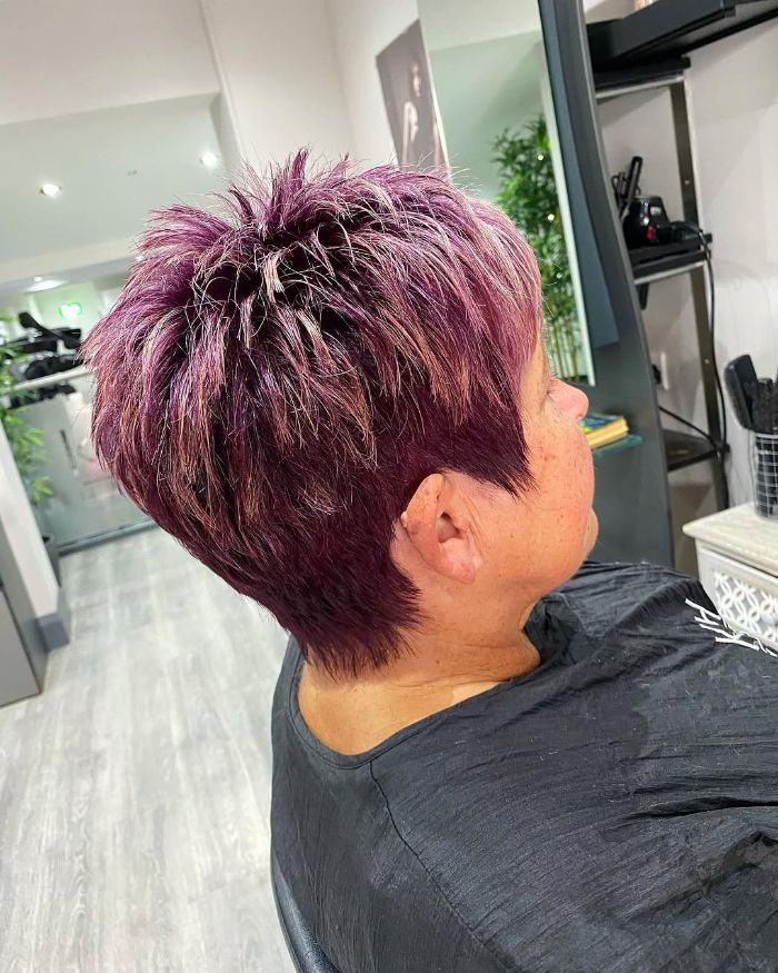 This short choppy hairstyle features bold, textured spikes that add a playful edge to the overall look, while deep plum highlights give it a rich and vibrant tone. The sharpness of the cut around the forehead creates a striking contrast against the voluminous, spiky top, perfect for those seeking a daring and energetic style. Ideal for fashion-forward individuals, this haircut suits those who want to make a statement while maintaining a modern and chic appearance.