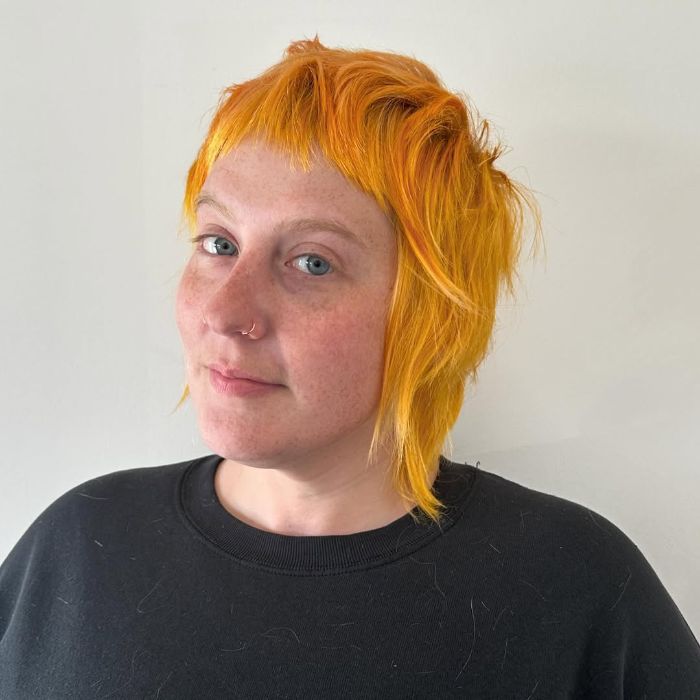 This short choppy haircut features a striking blend of texture and length, with pronounced layers that create a bold profile. The vibrant bleached peach tones accentuate the individuality of the style, while the asymmetrical cut showcases an edgy mullet silhouette, offering a playful yet sophisticated vibe. Ideal for those looking to express their unique personality, this haircut suits anyone eager to make a statement with their look.