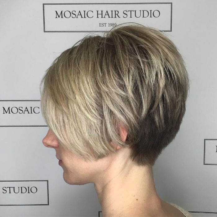This modern choppy bob features a distinctive layered cut that creates an airy, voluminous look, particularly at the crown. The contrast of light blonde highlights against a darker undercut adds depth and dimension, making it a perfect choice for those seeking a fresh, youthful style. Ideal for individuals who want low-maintenance hair with an edgy flair, this haircut effortlessly combines sophistication with a playful attitude.